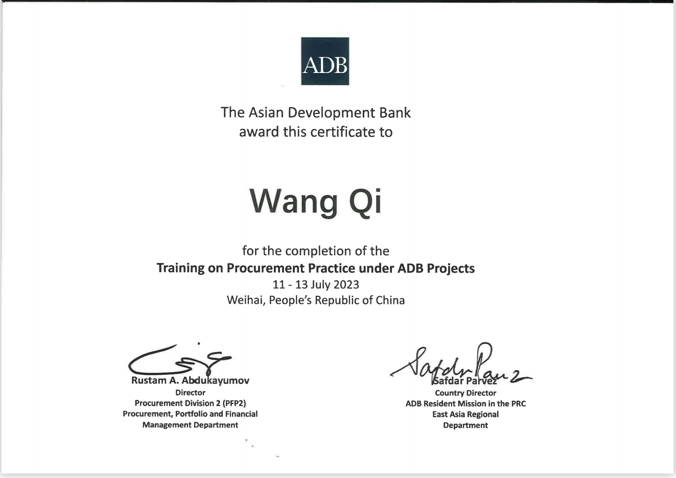 此次培訓(xùn)重點(diǎn)對(duì)亞行采購政策、合同管理與合同計(jì)劃、亞行財(cái)務(wù)盡職分析要求、項(xiàng)目會(huì)計(jì)核算、項(xiàng)目財(cái)務(wù)報(bào)表、項(xiàng)目審計(jì)等主題進(jìn)行授課。通過演講、案例研究、小組討論、結(jié)業(yè)測(cè)試及經(jīng)驗(yàn)豐富的執(zhí)行機(jī)構(gòu)分享經(jīng)驗(yàn)等方式使參訓(xùn)人員加深了解亞行貸款采購、財(cái)務(wù)政策/規(guī)定并拓展實(shí)踐知識(shí)。甘肅文旅集團(tuán)國際金融組織貸款項(xiàng)目管理辦公室一名同志代表亞行貸款甘肅環(huán)境可持續(xù)鄉(xiāng)村振興與發(fā)展項(xiàng)目作了大會(huì)交流發(fā)言,分享了項(xiàng)目管理工作中的經(jīng)驗(yàn)和關(guān)注點(diǎn)。培訓(xùn)授課結(jié)束,三名參訓(xùn)人員獲得了結(jié)業(yè)證書。