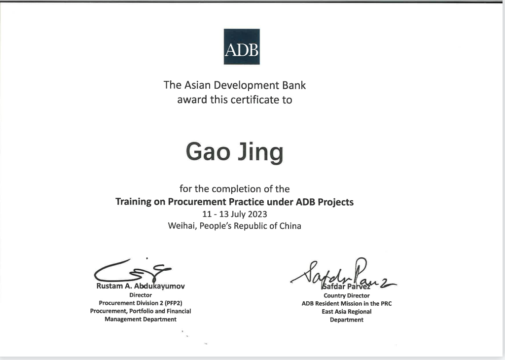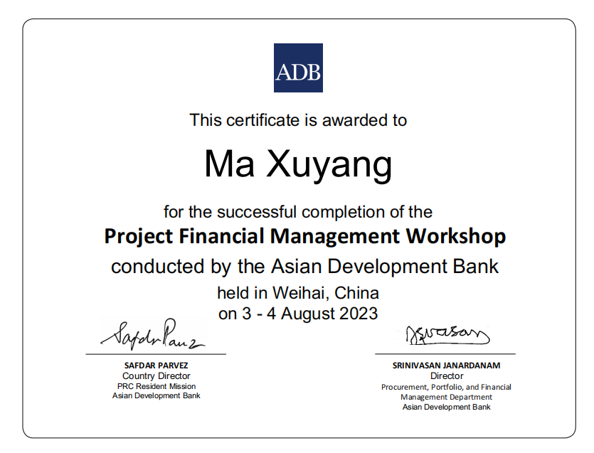 此次培訓(xùn)重點對亞行采購政策、合同管理與合同計劃、亞行財務(wù)盡職分析要求、項目會計核算、項目財務(wù)報表、項目審計等主題進行授課。通過演講、案例研究、小組討論、結(jié)業(yè)測試及經(jīng)驗豐富的執(zhí)行機構(gòu)分享經(jīng)驗等方式使參訓(xùn)人員加深了解亞行貸款采購、財務(wù)政策/規(guī)定并拓展實踐知識。甘肅文旅集團國際金融組織貸款項目管理辦公室一名同志代表亞行貸款甘肅環(huán)境可持續(xù)鄉(xiāng)村振興與發(fā)展項目作了大會交流發(fā)言,分享了項目管理工作中的經(jīng)驗和關(guān)注點。培訓(xùn)授課結(jié)束,三名參訓(xùn)人員獲得了結(jié)業(yè)證書。